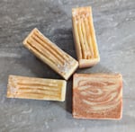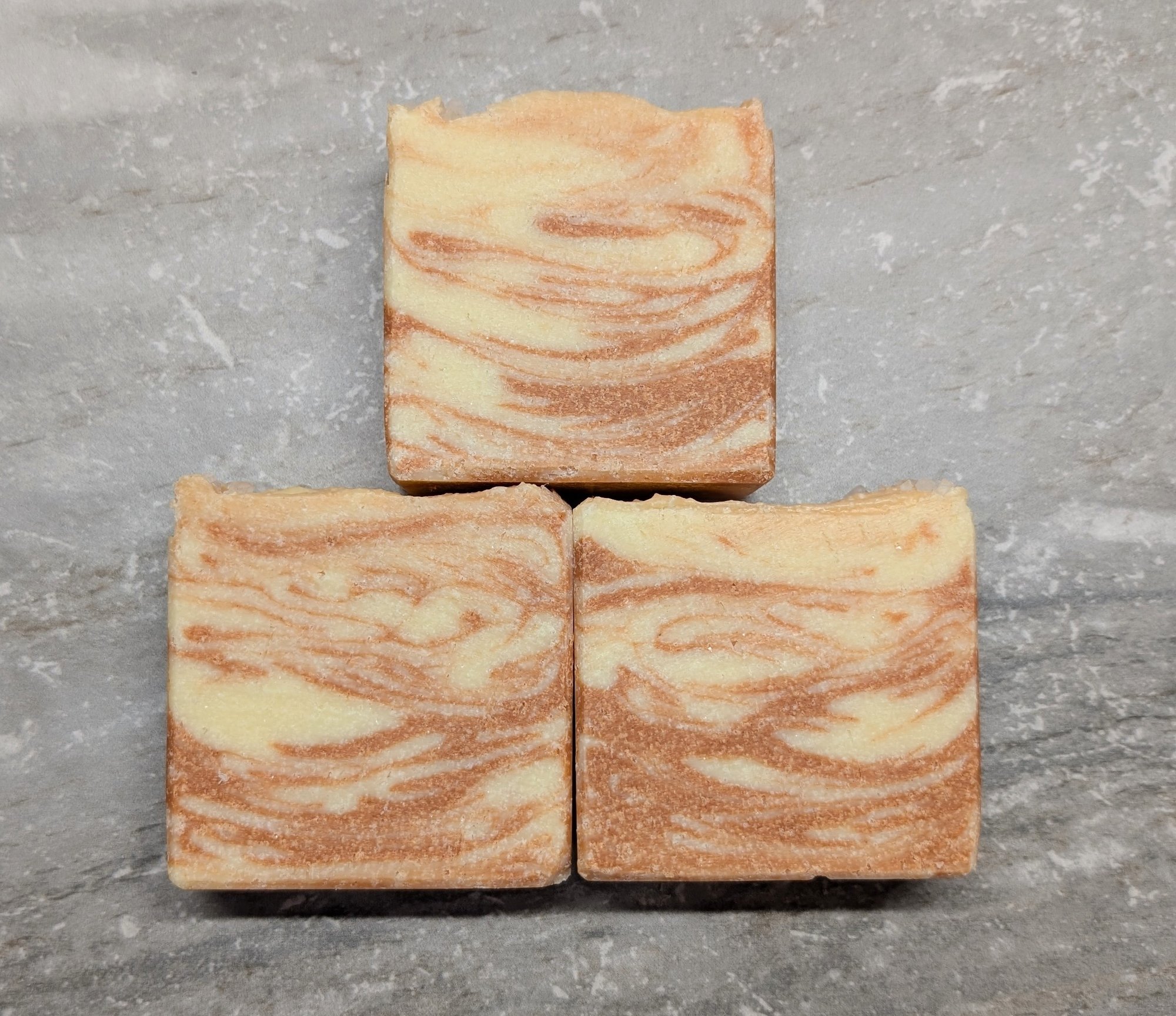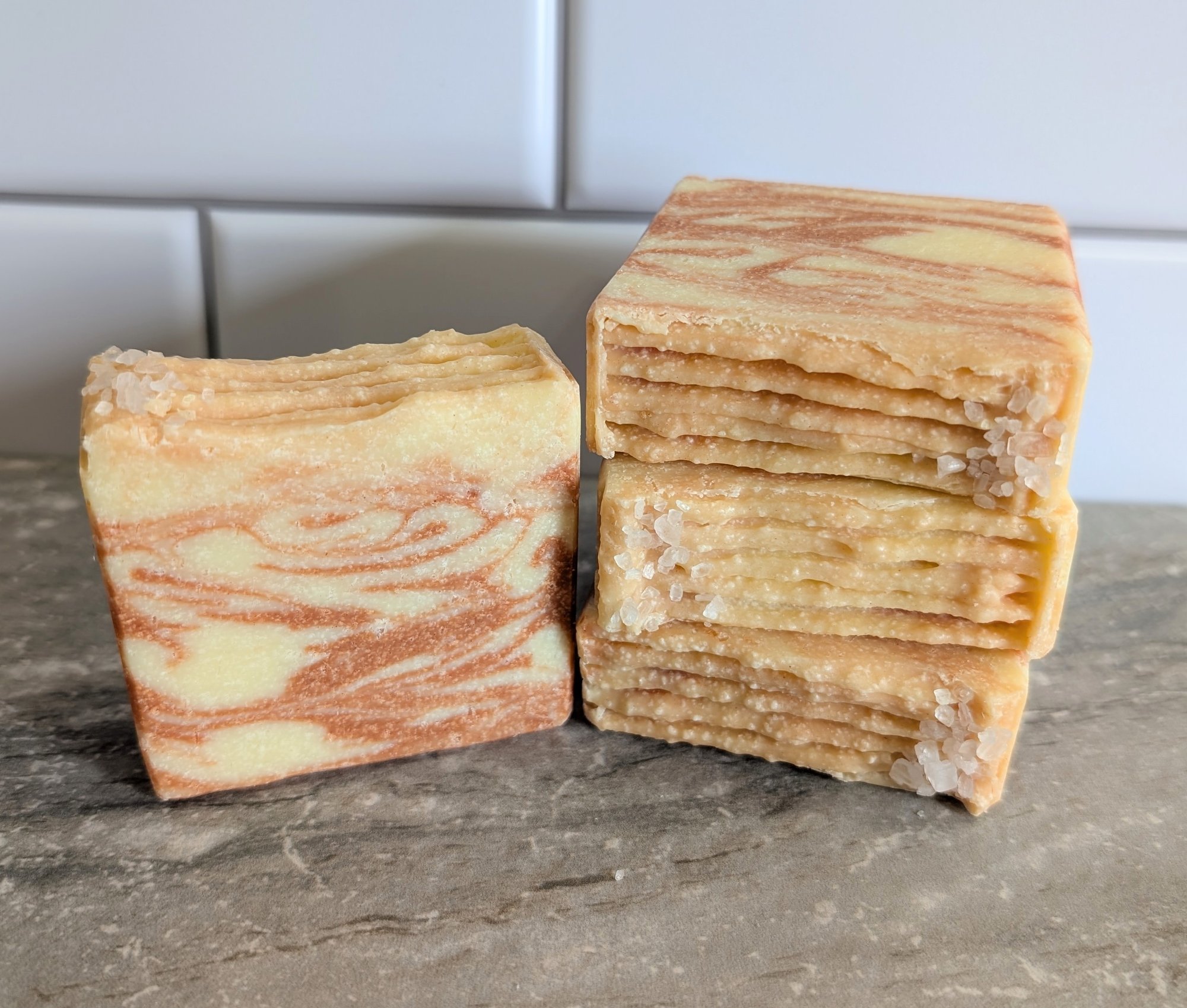 Ingredients: saponified oils (coconut oil, olive oil, castor oil), sea salt, coconut milk, essential oil blend (tangerine, clove), citric acid, water, kaolin clay, red brazilian clay